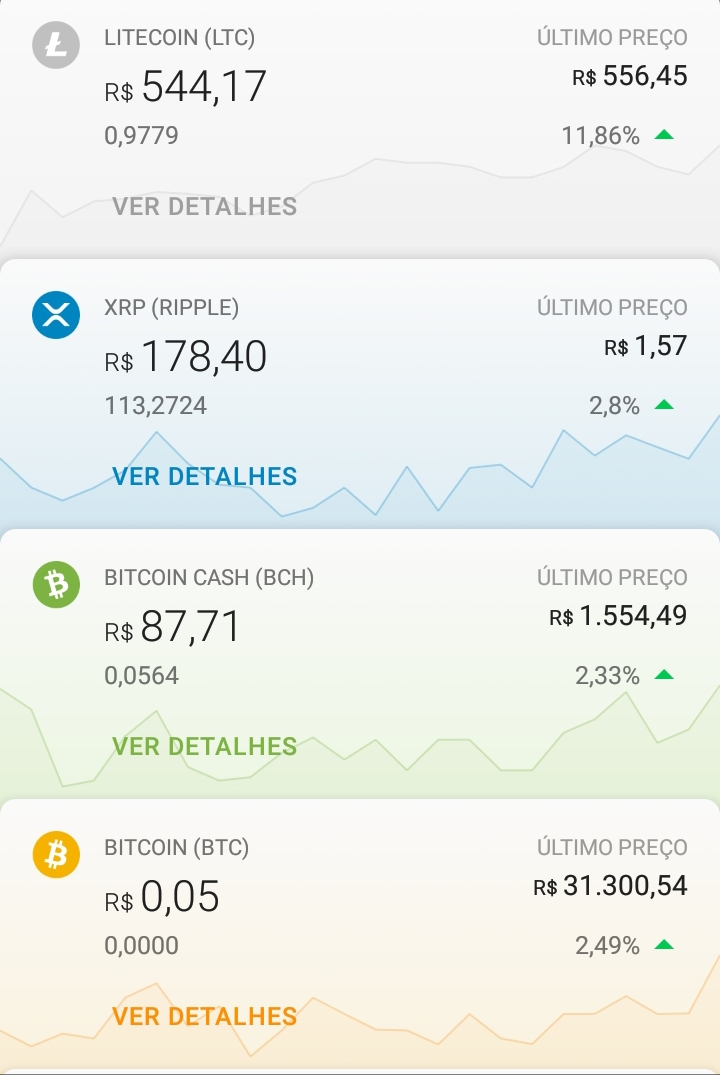 No momento vi que outras criptomoedas estavam em ascensão (sim, são muitas e muitas criptomedas no mercado), dentre elas estavam o RIPPLE (XRP) e o LITECOIN (LTC). Não perdi tempo e comprei elas enquanto estavam baratinhas, Litecoin, uns R$ 223 e Ripple, R$ 1,99. Foi uma unidade de LTC e 113,27 de XRP, totalizando R$ 225 e R$ 227, respectivamente. O XRP teve uma queda, mas o LTC só aumenta, meus R$ 225 se transformaram em R$ 544 como podem ver abaixo. (No momento desta publicação meus LTC está custando R$ 527,10).